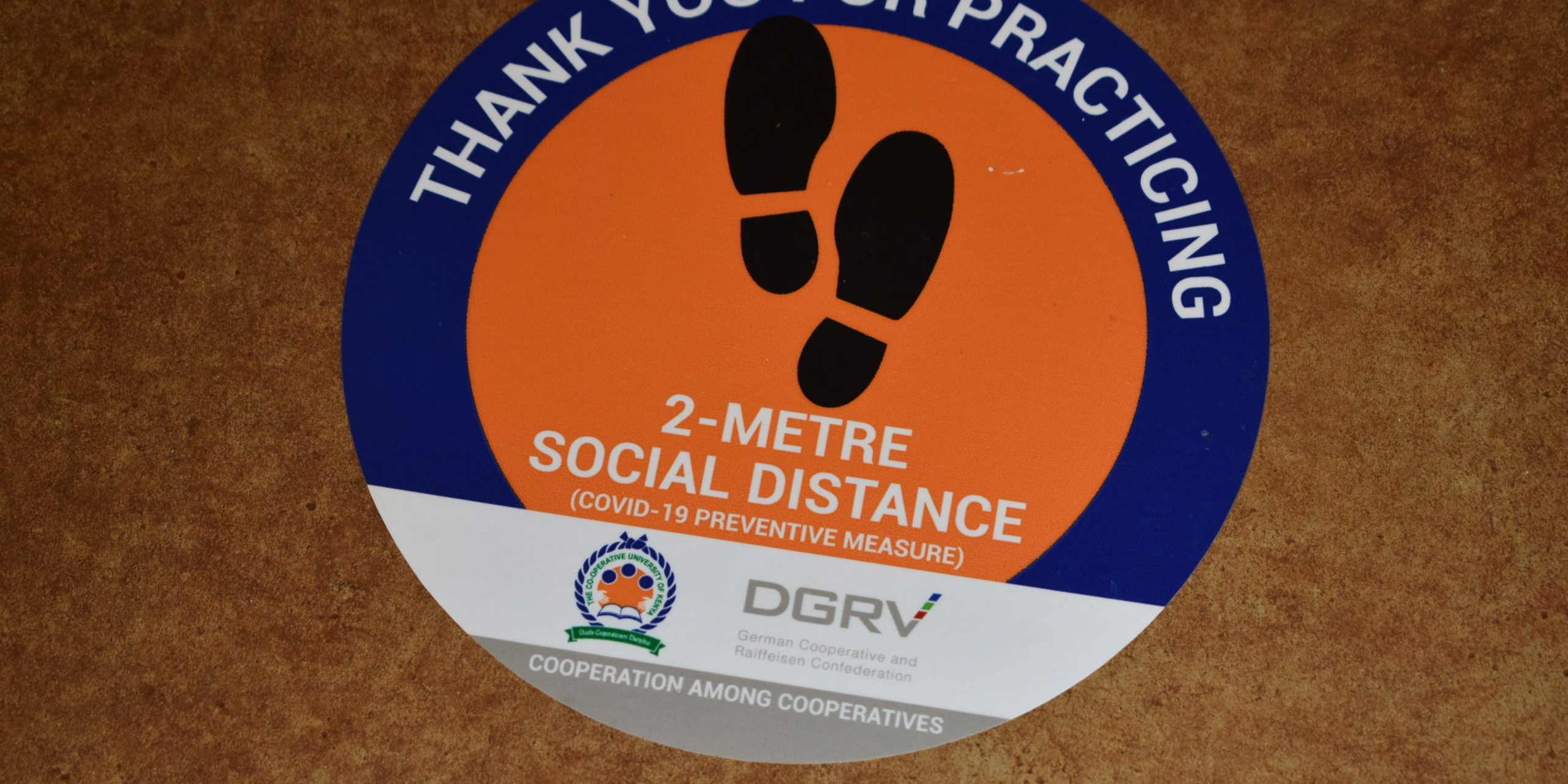 From the beginning of DGRV’s interventions in Kenya, The Co-operative University of Kenya (CUK) is one of our main national project partners. The University had to close all its campus sites since Corona was reported in Kenya (March 2020). While the operations are still on hold, CUK currently implements a health and safety concept to allow students to take up their studies again in a safe environment by September 2020. In this regard, DGRV assisted CUK to equip their main campus with „Social distance reminders“ which were designed to demonstrate the need for keeping distance between one person and another. During that engagement we covered 1200 m of corridor,offices, lecture halls,dispensary, entrances and canteens with specially produced floor stickers to contribute to CUK’s reopening preparation later this year.